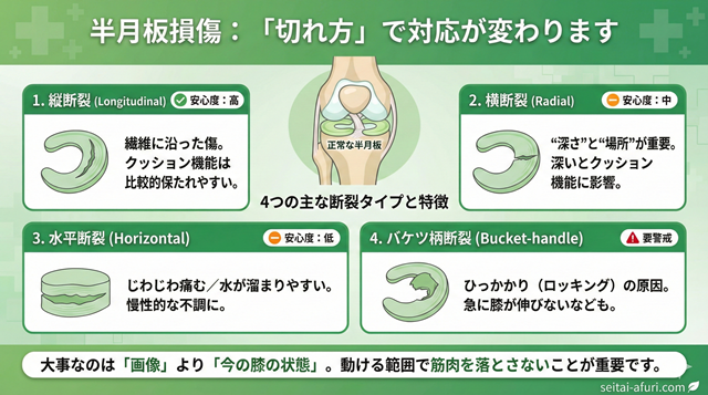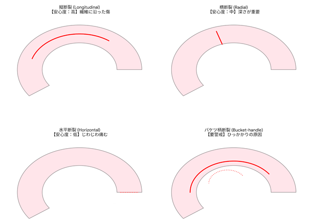 半月板は膝のクッションですが、実は切れ方(断裂の形)によって、膝への影響や出やすい症状が変わります。