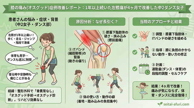 膝の痛み(オスグッド)の症例|1年以上続いた左膝痛が4ヶ月で改善した中2ダンス女子