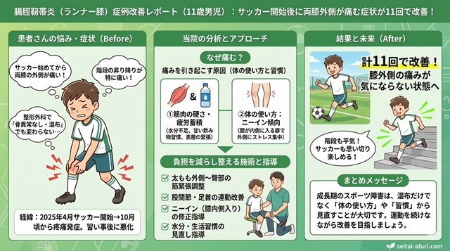 膝の痛みにはいくつかタイプがありますが、今回の痛みは「膝の外側」「階段で強い」「サッカー開始後から」という特徴があり、腸脛靭帯炎(ランナー膝)の状態に近いと判断しました。
