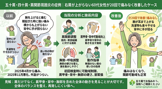 - 肩関節周囲炎(五十肩)の症例|右肩の挙上・外転・結帯動作の痛みが25回で改善(50代女性)